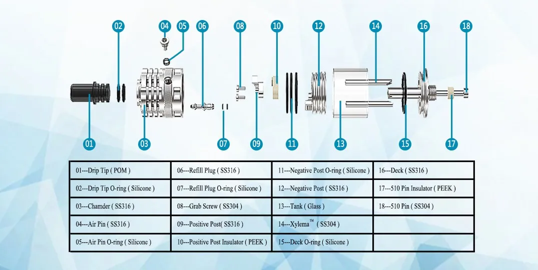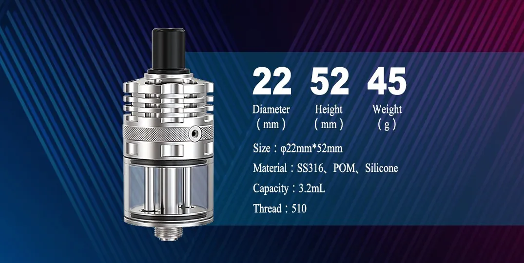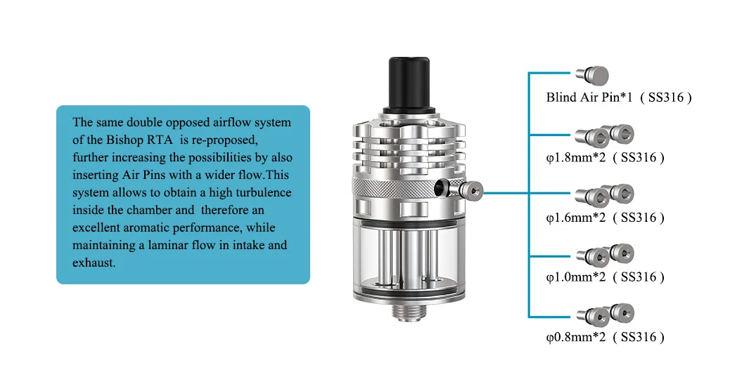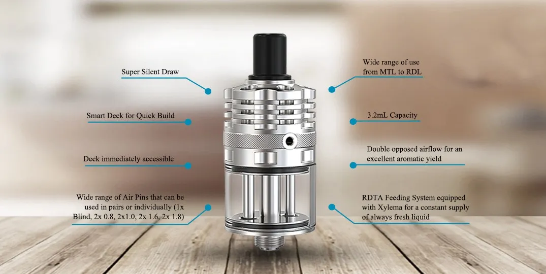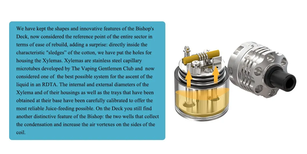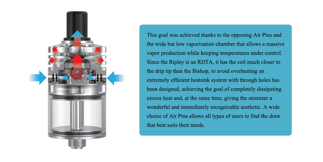 Ο Ripley είναι βασισμένος στο deck του πολύ επιτυχημένου Bishop. Έχει διάμετρο 22mm και η δεξαμενή του έχει χωρητικότητα 3.2ml. Διαθέτει δύο εισόδους αέρα στο επάνω μέρος του που δέχονται διαφόρων διαμέτρων pin για να βρείτε την ποσότητα του αέρα που σας ικανοποιεί.