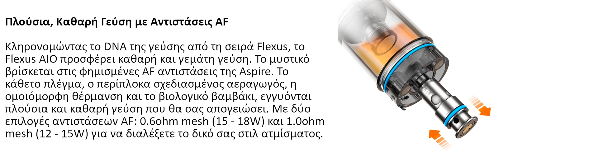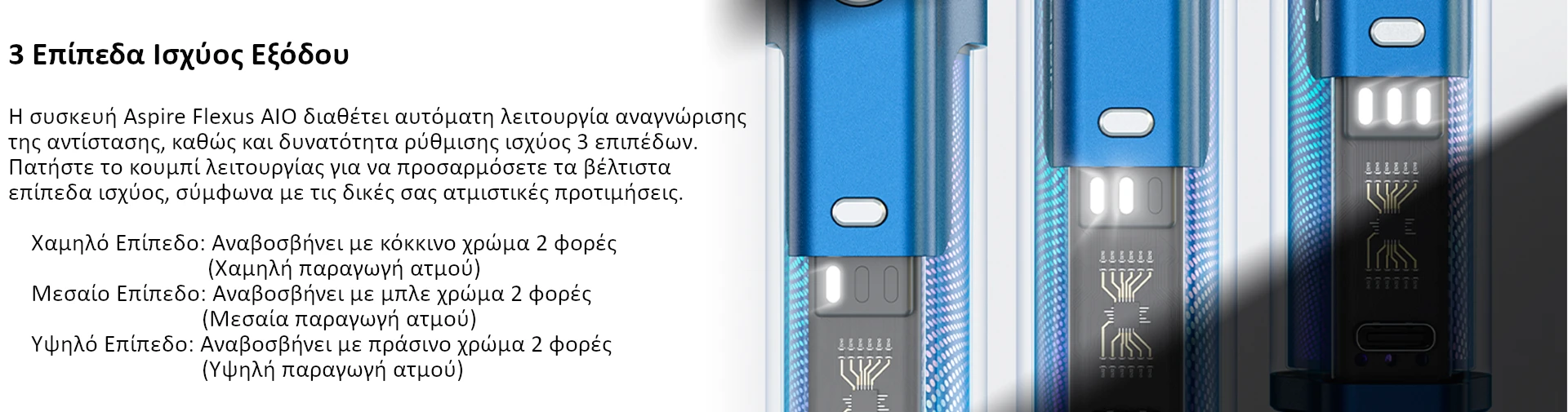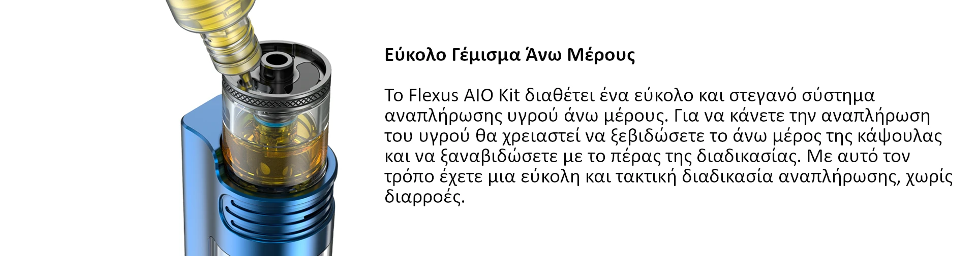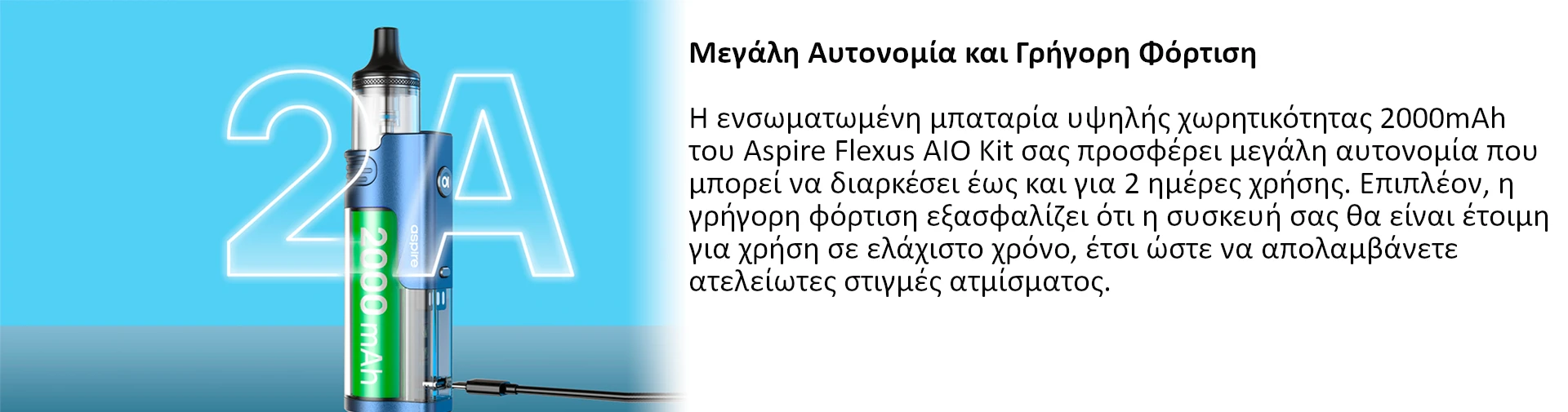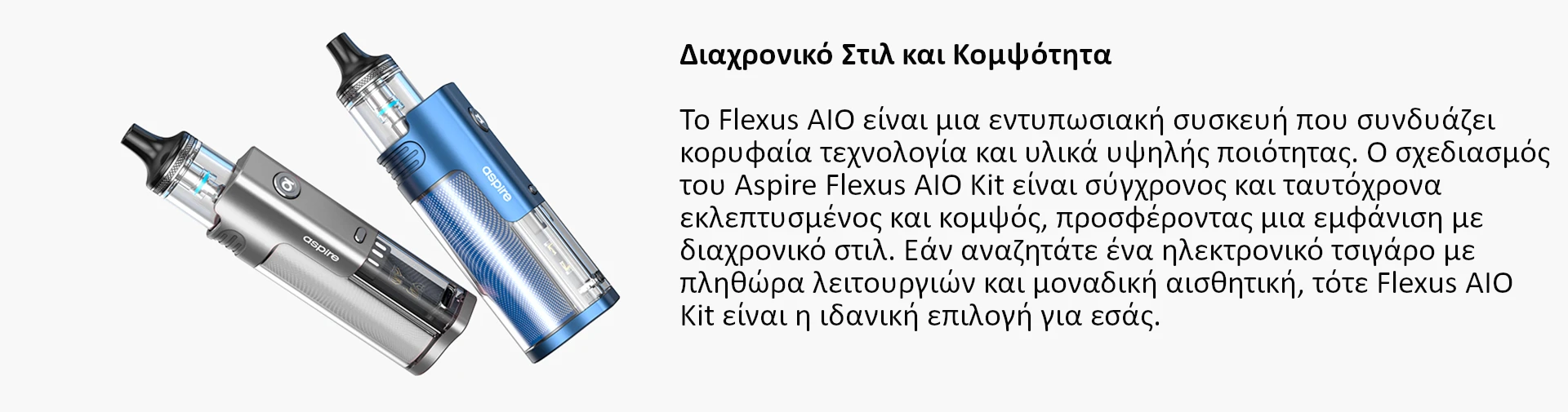 Το Aspire Flexus AIO Kit είναι μια συσκευή ηλεκτρονικού τσιγάρου που συνδυάζει εξαιρετική απόδοση, εκλεπτυσμένο σχεδιασμό, εξαιρετικά μεγάλη αυτονομία και πολλαπλές λειτουργίες για μια ολοκληρωμένη εμπειρία ατμίσματος! Ταιριάζει τέλεια στην παλάμη του χεριού σας, χάρη στη συμπαγή κατασκευή του και τραβάει όλα τα βλέμματα, με την κομψή του εμφάνιση και το εντυπωσιακό φινίρισμα υψηλής ποιότητας. Ανακαλύψτε τον κόσμο του Aspire Flexus AIO Kit και απολαύστε μια εξαιρετική εμπειρία ατμίσματος που θα σας ενθουσιάσει!