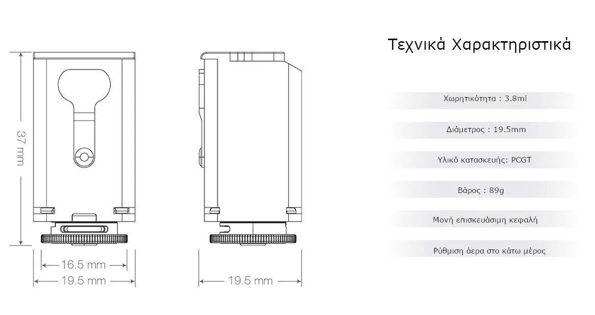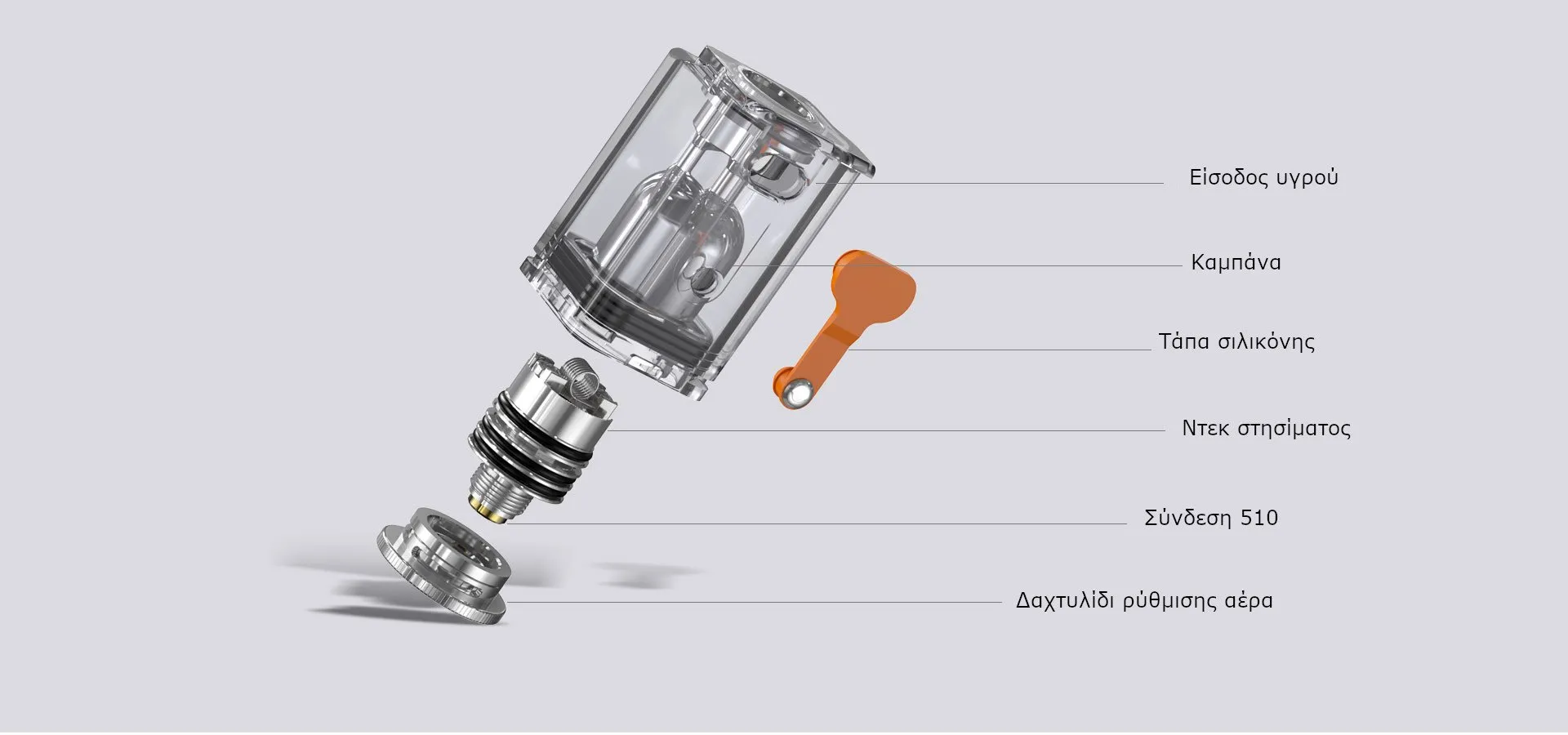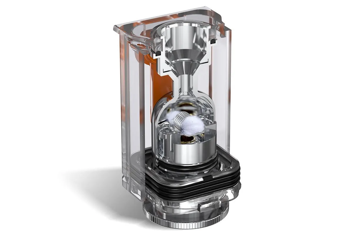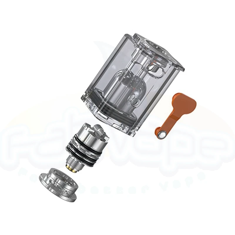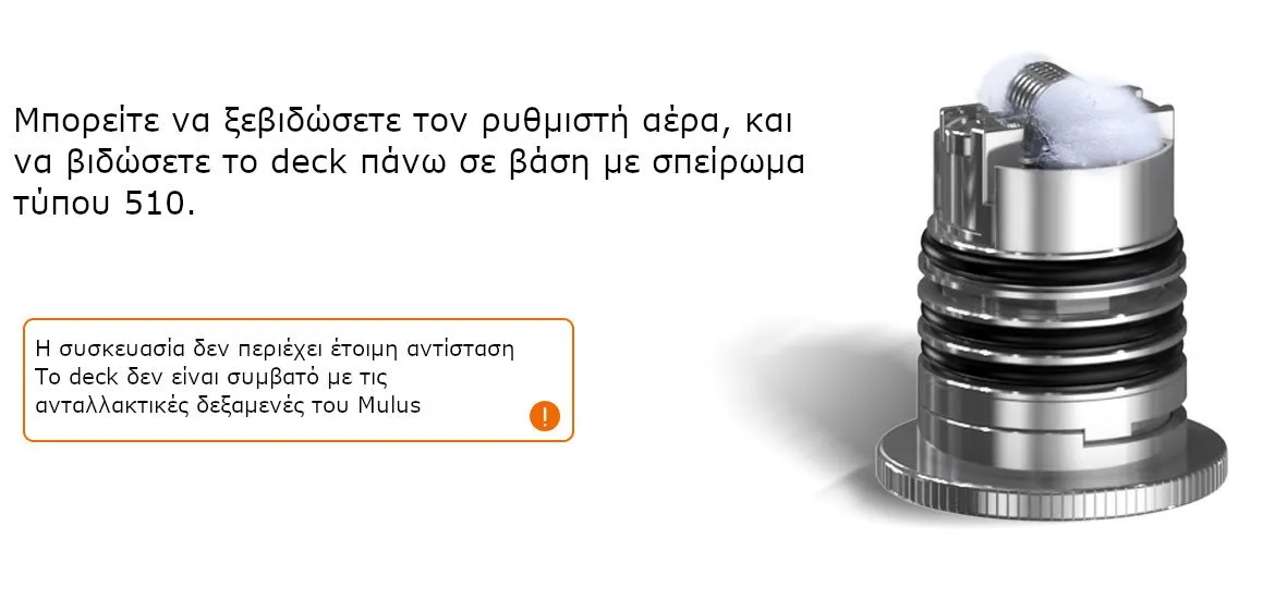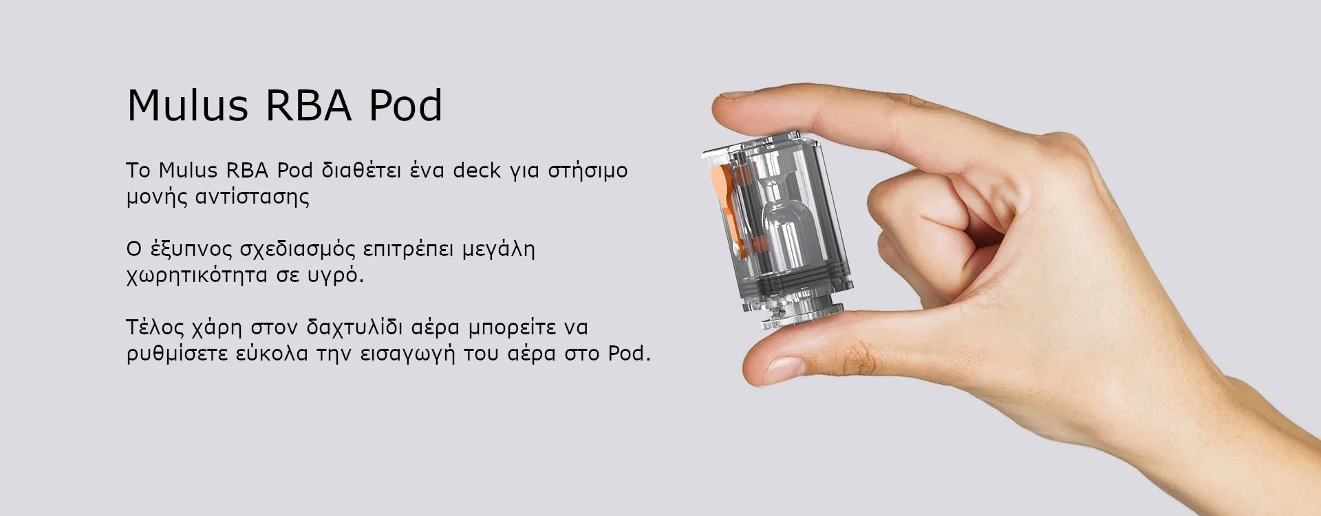 Το Mulus RBA Pod αποτελείτε από 3 μέρη : Την Δεξαμενή, το deck για κατασκευή της αντίστασης και τον προσαρμογέα. Το deck είναι πολύ απλό στον σχεδιασμό και επιτρέπει την εύκολη κατασκευή μονής αντίστασης.