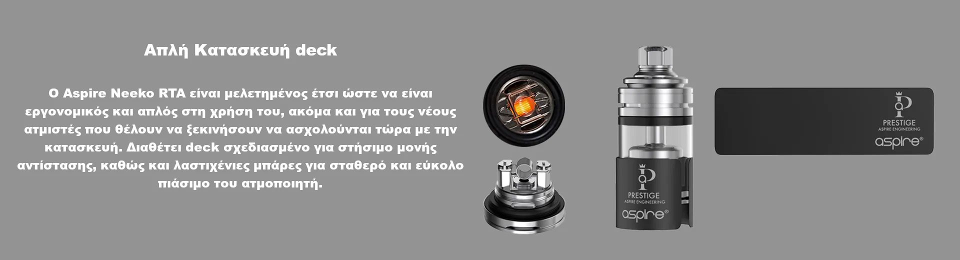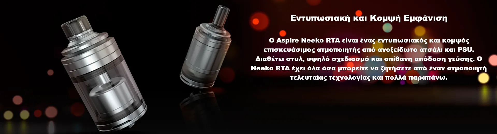 Εάν είστε οπαδός του MTL ατμίσματος, τότε θα λατρέψετε τον επισκευάσιμο ατμοποιητή Aspire Neeko RTA. Είναι το πρώτο προϊόν της σειράς Prestige, σχεδιασμένο και κατασκευασμένο πλήρως από την Aspire. O Neeko RTA έχει χωρητικότητα 2ml, διαθέτει διάμετρο 22mm και είναι κατασκευασμένος από υψηλής ποιότητας ανοξείδωτο ατσάλι και PSU.