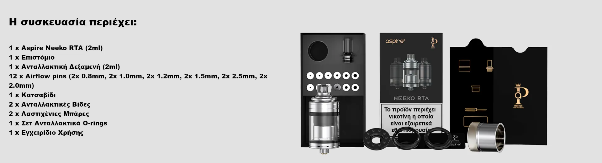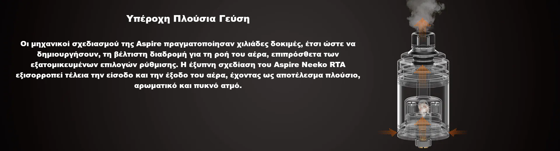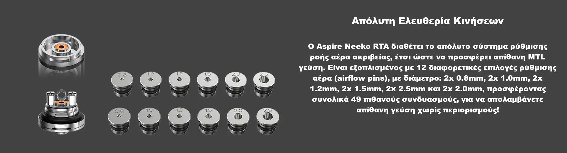 Με τον Aspire Neeko RTA μπορείτε να απολαύσετε ένα μοναδικό σύστημα ελέγχου ροής αέρα και απίθανη πλούσια γεύση! Η συσκευή διαθέτει 12 εξαρτήματα ρύθμισης ροής αέρα, σε διαφορετικές διαμέτρους, τα οποία προσφέρουν 49 επιλογές για να δημιουργήσετε το απόλυτο άτμισμα.\