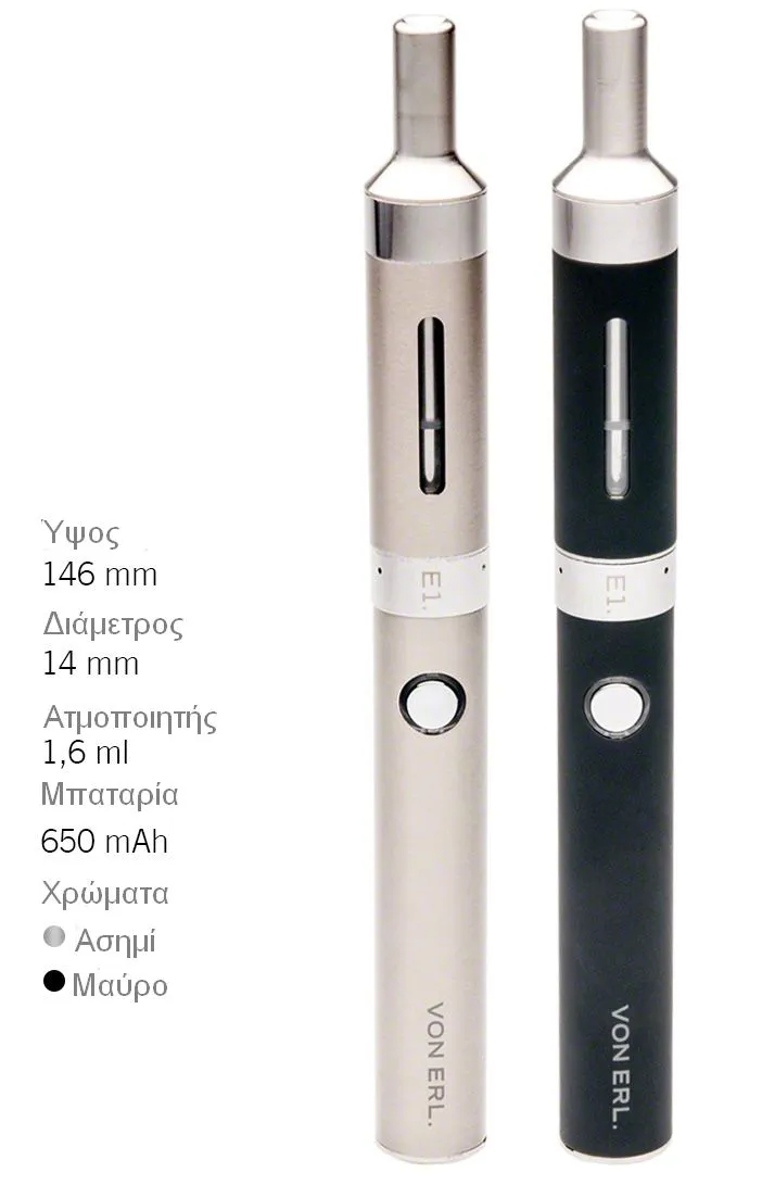 - 1 x E1. VON ERL. Ασημί μπαταρία 650mAh με ατμοποιητή 1.6ml