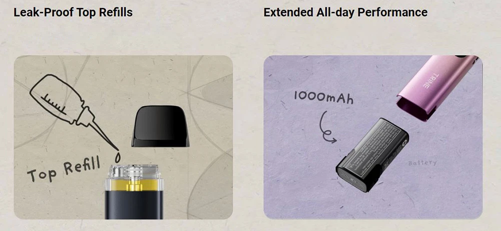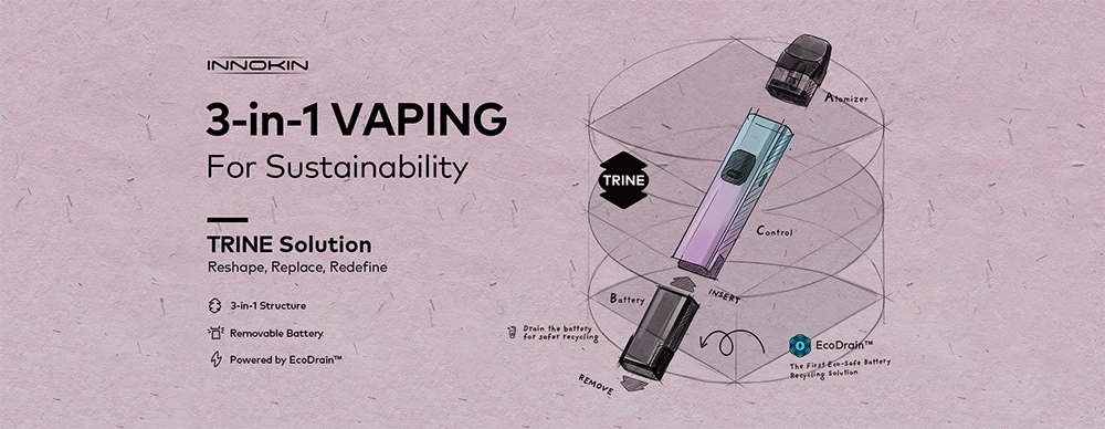 Παρουσιάζοντας την δομή 3 σε 1 - κύριο σώμα συσκευής, ατμοποιητής, αφαιρούμενη και επαναφορτιζόμενη μπαταρία - το Trine επενδύει στη βιωσιμότητα και την εξοικονόμηση, εξασφαλίζοντας εξαιρετική απόδοση με το καινοτόμο σύστημα αντικατάστασης μπαταρίας και την τεχνολογία EcoDrain™