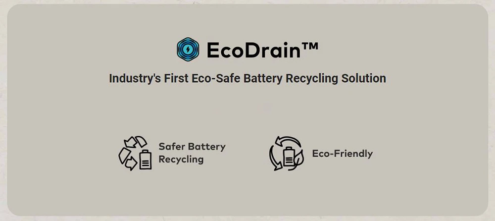 Βελτιώστε την ασφάλεια με την πατενταρισμένη τεχνολογία εκφόρτισης μπαταρίας EcoDrain™! Το EcoDrain σάς επιτρέπει να αποφορτίζετε τις μπαταρίες πριν από την ανακύκλωση τους, ελαχιστοποιώντας τον κίνδυνο πυρκαγιάς.